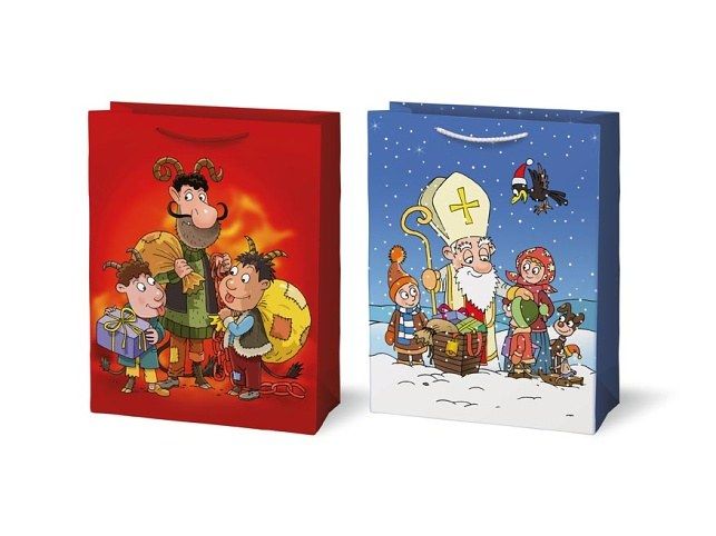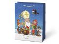 Papírová vánoční dárková taška s vánočními motivy. Taška má pevné ucho na lehké přenášení a štítek na napsání jména nebo přání.