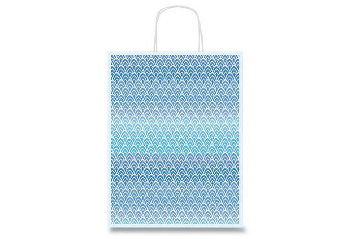 Dárková papírová taška s matnou laminací, v atraktivním modrobílém designu.