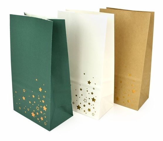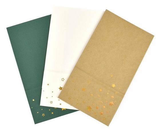 Sada tří papírových sáčků ve třech barvách, se zlatými hvězdičkami.
