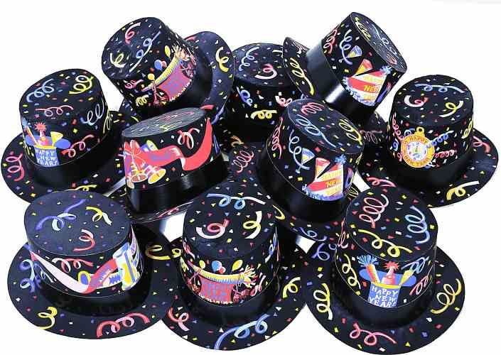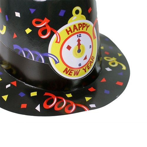 Papírový klobouk s nápisem HAPPY NEW YEAR je senzačním doplňkem na oslavu nebo večírek při vítání Nového roku! Prodejné pouze v balení po 12 kusech.