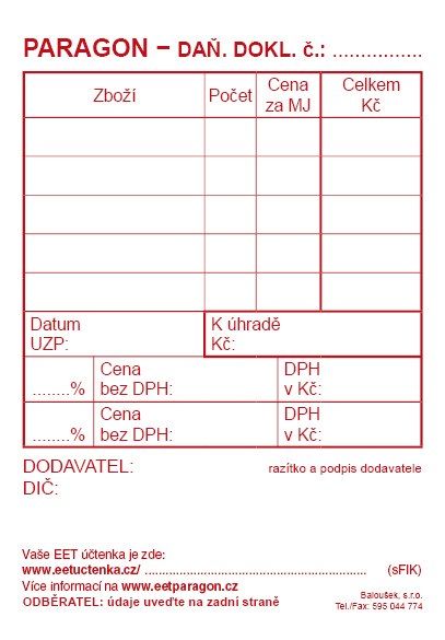 Nebojte se EET - S námi nemusíte nic měnit a můžete dál používat tento daňový doklad! Navíc potřebujete jen SMS, tužku a službu EETparagon.cz! Do EET se přihlásíte a službu EETparagon.cz si zprovozníte od 17.02.2020 na vybraných pobočkách České pošty, s.p. - Nepotřebujete žádný nový pokladní systém, EET kasu, tiskárnu ani připojení k internetu. Pro více informací navštivte www.eetparagon.cz pište na e-mail info@eetparagon.cz nebo volejte na 210 320 210.