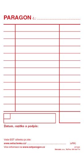 Nebojte se EET - S námi nemusíte nic měnit a můžete dál používat tento daňový doklad! Navíc potřebujete jen SMS, tužku a službu EETparagon.cz! Do EET se přihlásíte a službu EETparagon.cz si zprovozníte od 17.02.2020 na vybraných pobočkách České pošty, s.p. - Nepotřebujete žádný nový pokladní systém, EET kasu, tiskárnu ani připojení k internetu. Pro více informací navštivte www.eetparagon.cz pište na e-mail info@eetparagon.cz nebo volejte na 210 320 210.