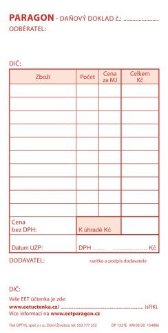 Paragon daňový doklad, samopropisovací, nečíslovaný. Tiskopis je ve formátu 7,5 x 14,8 cm na výšku a obsahuje 50 listů bez perforace.