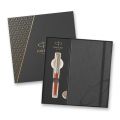 Sada obsahuje zápisník v šedé barvě a kuličkové pero Parker 51 Premium Rage Red s červeně lakovaným tělem, vrchní část z ušlechtilé nerezové oceli s reliéfním zdobením vytvořeným laserem, korunka z pryskyřice v tónech perleti. V kombinaci s doplňky v barvě zlata.