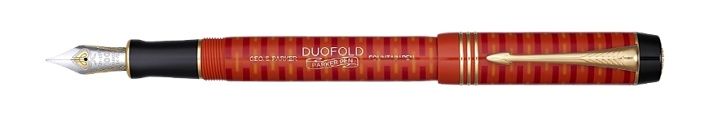 Plnicí pero větší velikosti, tělo a víčko zněkolika tenkých vrstev difuzně vázané vzácné pryskyřice vytváří nápadné barevné pruhy. Úchop zlesklé černé pryskyřice. Korunka, víčka zplátkového zlata srytinou 100th - stého výročí. Prstence na víčku, typické pro Duofold, jsou zplátkového zlata. Ikonický klip ve tvaru šípu pokovený zlatem. Hrot, z18karátového zlata (ryzost Au 750/1000) se zdobnou rytinou karetního esa a stého výročí, částečně pokovený rhodiem., PLNICÍ PERO: