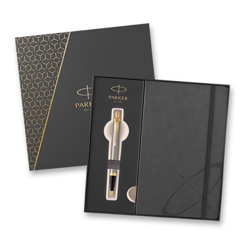 Sada obsahuje zápisník v šedé barvě a kuličkové pero Parker IM Brushed Metal s broušeným mosazným tělem a lakovanou povrchovou úpravou. V kombinaci s doplňky pokovenými zlatem, s leštěnou úpravou.
