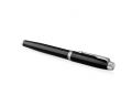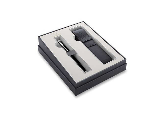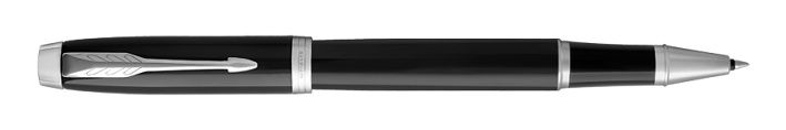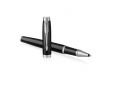 Roller Parker IM Essential Matte Black CT v dárkové kazetě s pouzdrem s mosazným tělem a víčkem a leskle černou lakovanou povrchovou úpravou. Roller má kombinaci doplňků pokovenými chromem.