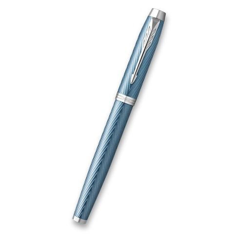 Roller Parker IM Premium Blue Grey CT má lakované mosazné tělo a víčko s reliéfní rytinou ikonického vzoru chevron, vyvedenou pomocí laseru. V kombinaci s doplňky pokovenými chromem.