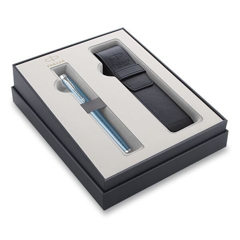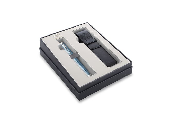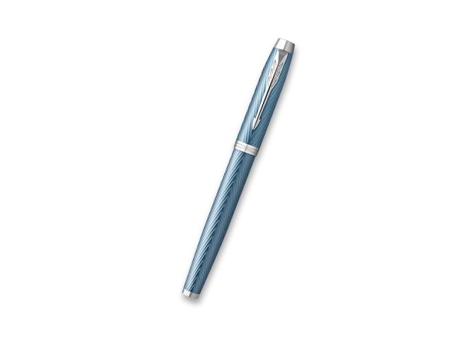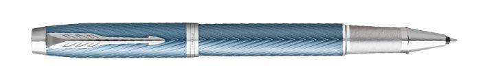 Roller Parker IM Premium Grey CT s mosazným tělem a víčkem, modře lakovanou povrchovou úpravou s reliéfní rytinou ikonického vzoru chevron, vyvedenou pomocí laseru. V kombinaci s doplňky pokovenými chromem. V dárkové kazetě s pouzdrem.