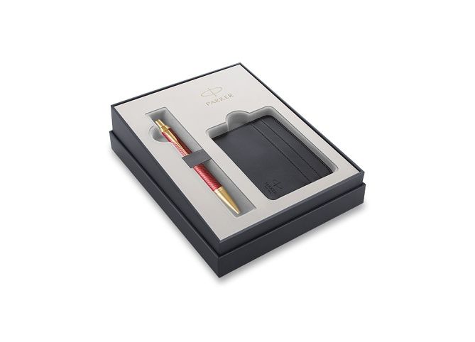 Kuličková tužka Parker IM Premium Red GT v dárkové kazetě s pouzdrem na karty s červeně lakovaným mosazným tělem s reliéfní rytinou vyvedenou pomocí laseru. V kombinaci s doplňky pokovenými zlatem.