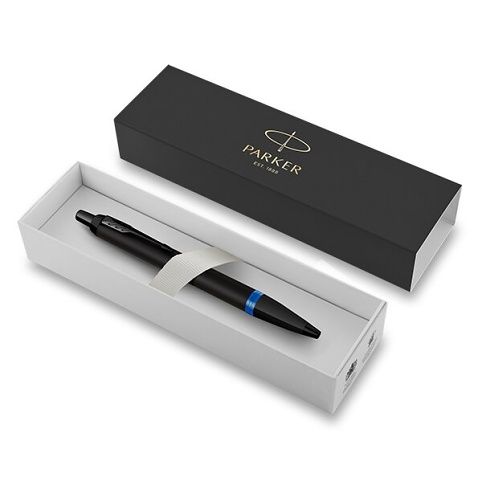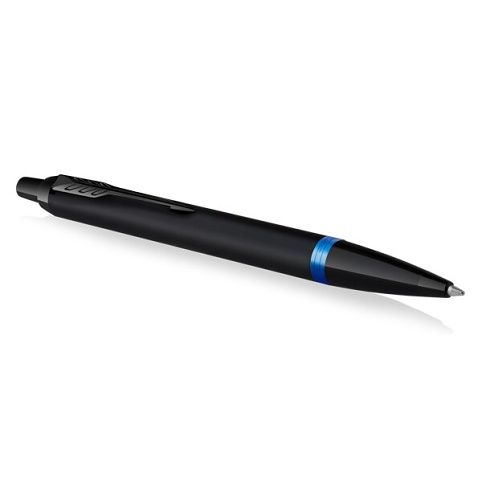 Kuličková tužkaParker IM Professionals má tělo pokryté černým lakem, potažené pomocí techniky PVD odolnou matně černou vrstvou. Dolní úchopovou část zdobí výrazný prstenec v modré barvě.