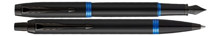 Sada plnicí pero a kuličková tužka Parker IM Vibrant Rings Marine Blue v dárkové kazetě. Tělo a víčko má pokryté černým lakem, potažené pomocí techniky PVD odolnou matně černou vrstvou. Víčko a dolní úchopovou část zdobí výrazný barevný prstenec. V kombinaci s doplňky potaženými pomocí techniky PVD odolnou matně černou vrstvou. Hrot je z ušlechtilé nerezové oceli zdobený jemnou rytinou, potažený odolnou matně černou vrstvou.