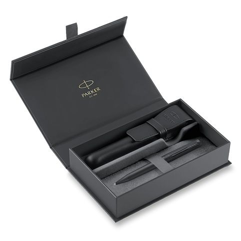 Dárková kazeta s kuličkovým perem Parker Ingenuity Black BTs mosazným tělem pokrytým saténově matným černým lakem, horní část těla zdobená pravidelnými rytinami. V kombinaci s doplňky potaženými pomocí techniky PVD matně černou barvou.