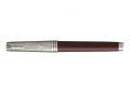 Mosazné tělo pokryté karmínovým lakem, doplněné mosazným víčkem se zdobným vzorem vytvořeným leptáním a pokoveným rutheniem. V kombinaci s doplňky pokovenými rutheniem. Hrot z 18karátového zlata (ryzost Au 750/1000) zcela pokovený rutheniem. Plnicí pero: šroubovací víčko konvertor De Luxe s pístem pro plnění pera inkoustem Quink z lahvičky možnost používat i inkoustové bombičky Quink Vyrobeno ve Francii. Dodáváno s 2 černými bombičkami, v elegantním dárkovém balení.