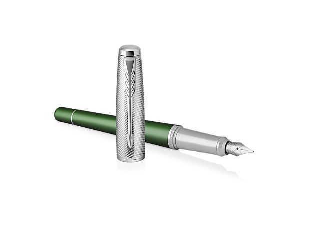 Metalické zelené tělo z eloxovaného hliníku, upravené pískováním. Mosazné víčko s povrchovou dekorativní strukturou vytvořenou leptáním, pokovené chromem a leštěné. V kombinaci s doplňky pokovenými chromem. Hrot z ušlechtilé nerezové oceli.