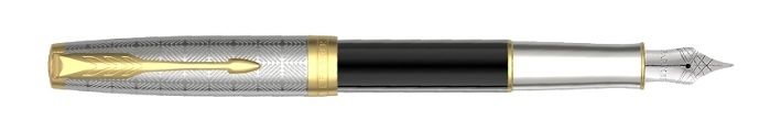 Plnicí pero Parker Sonnet Premium Metal Black GT má černě lakované tělo a víčko z leštěné nerezové oceli se zdobným vzorem vytvořeným leptáním. V kombinaci s pozlacenými doplňky. Hrot z 18karátového zlata (ryzost Au 750/1000) s křížovou rytinou, pokovený rhodiem.