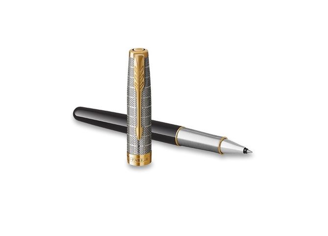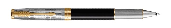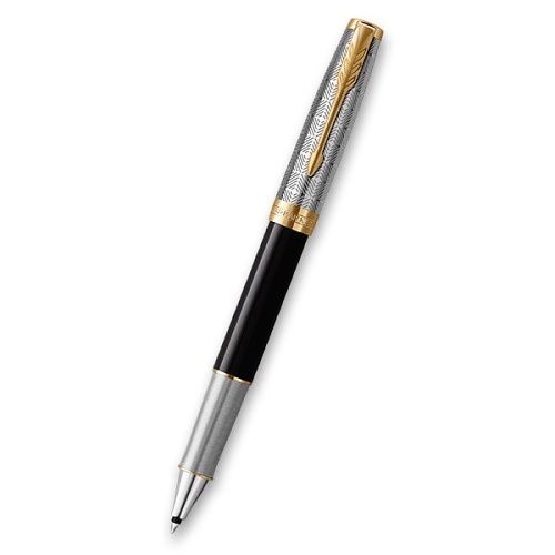 Roller Parker Sonnet Premium Metal Black GT má černě lakované tělo a víčko z leštěné nerezové oceli se zdobným vzorem vytvořeným leptáním. V kombinaci s pozlacenými doplňky.