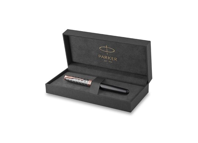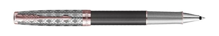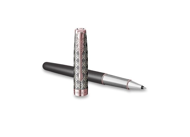 RollerParker Sonnet Premium Metal Grey PGT má šedě lakované tělo a víčko z leštěné nerezové oceli se zdobným vzorem vytvořeným leptáním. V kombinaci s doplňky pokovenými růžovým zlatem.