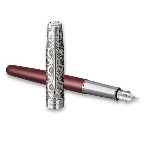 Plnicí pero Parker Sonnet Premium Metal Red CT má vínově lakované tělo a víčko z leštěné nerezové oceli se zdobným vzorem vytvořeným leptáním. V kombinaci s doplňky pokovenými nikl-palladiem. Hrot je z 18karátového zlata (ryzost Au 750/1000) s křížovou rytinou, pokovený rhodiem.