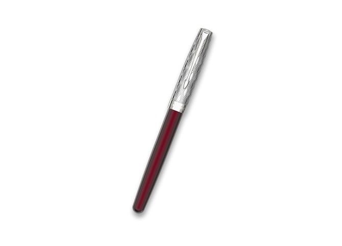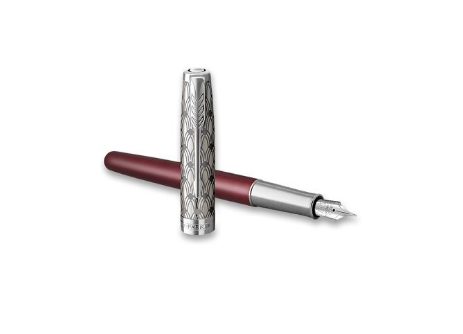 Plnicí pero Parker Sonnet Premium Metal Red CT má vínově lakované tělo a víčko z leštěné nerezové oceli se zdobným vzorem vytvořeným leptáním. V kombinaci s doplňky pokovenými nikl-palladiem. Hrot je z 18karátového zlata (ryzost Au 750/1000) s křížovou rytinou, pokovený rhodiem.