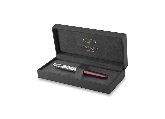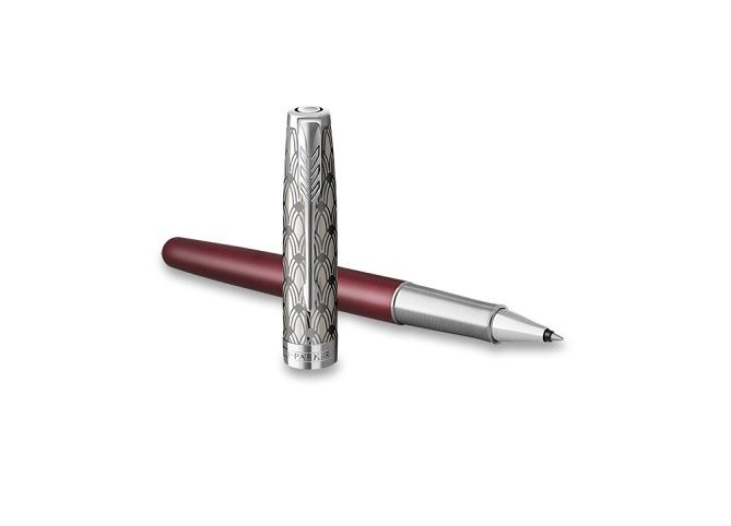 Roller Parker Sonnet Premium Metal Red CT má vínově lakované tělo a víčko z leštěné nerezové oceli se zdobným vzorem vytvořeným leptáním. V kombinaci s doplňky pokovenými nikl-palladiem.