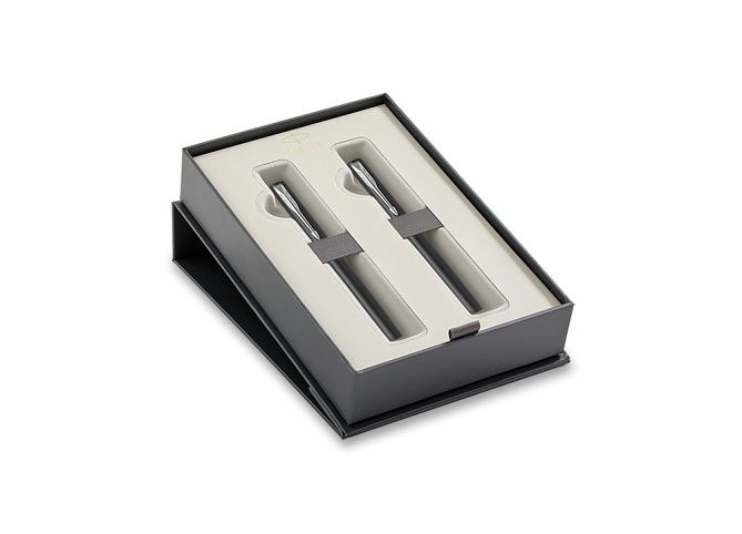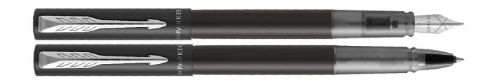 Sada plnicí pero a roller Parker Vector XL Black v dárkové kazetě. Mosazné tělo a víčko pokryté černým saténovým metalickým lakem. Úchopová část těla je transparentní. V kombinaci s doplňky pokovenými chromem. Hrot z ušlechtilé nerezové oceli.