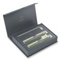 Sada DUO box obsahuje plnicí pero Parker Vector XL Green a roller Parker Vector XL Green. Mosazné tělo a víčko pokryté zeleným saténovým metalickým lakem. Úchopová část těla je transparentní. V kombinaci s doplňky pokovenými chromem. Hrot pera je z ušlechtilé nerezové oceli.