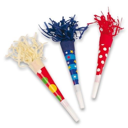 Barevné trumpety s různými motivy a střapci. Balení 3 ks.