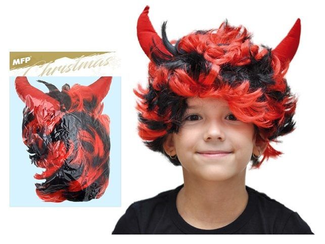 Čertovská paruka s rohy a krátkými černo červenými vlasy. Na vniřní straně paruky je prodyšná sítka, díky tomu se Vám nebude potit v masce hlava. Okraj paruky je opatřený gumičkou, aby maska dobře přilnula a nepadala. Výrobek je zdravotně nezávadný. Uvedená cena je za 1 ks.