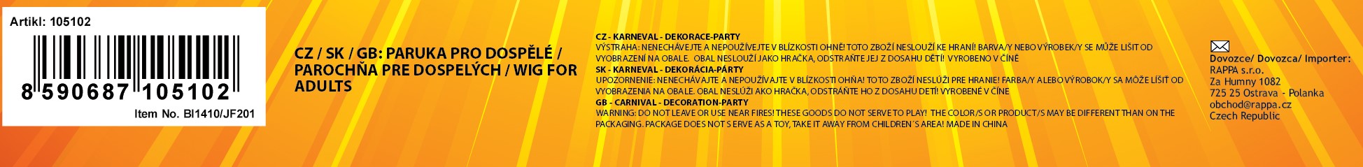 Karnevalová paruka v motivu čertice. Paruká má dlouhé červené vlasy, krátkou ofinou a je dekorována čertími růžky.