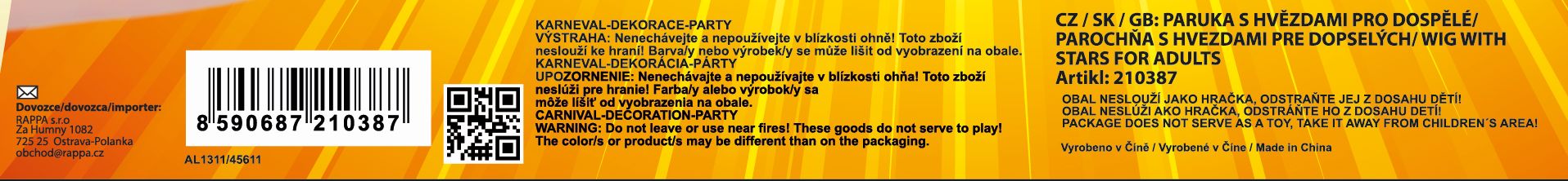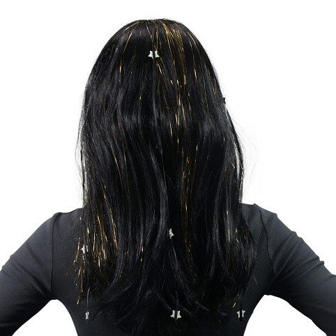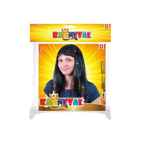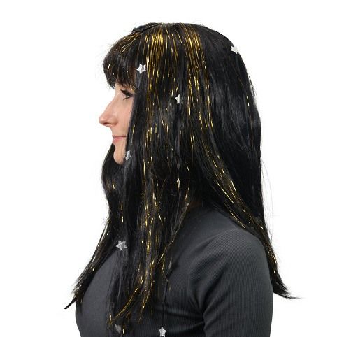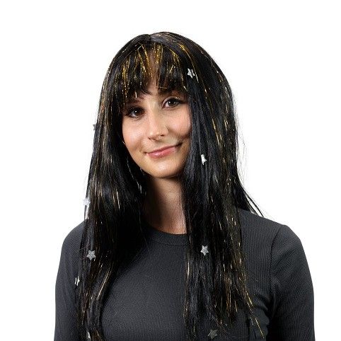 Karnevalová paruka v černé barvě je zdobená zlatými vlásky a stříbrnýma hvězdičkama. Perfektní doplněk na karneval nebo párty!