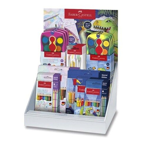 Souprava kvalitních pastelek ve standardním i jumbo provedení z kolekce Faber-Castell Unicorn a Dinosaur a vodové barvy Connector s atraktivními štětci v pastelových nebo základních barvách.
