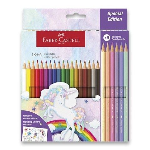 Souprava 24 kusů (18+6) klasických šestihranných dřevěných pastelek Faber-Castell s tématikou jednorožce. Tloušťka tuhy 3,3 mm.