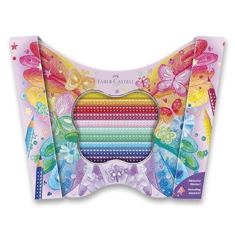 Kvalitní pastelkyPastelky Faber-Castell Sparkle s glitrovým efektem na těle v atraktivních barvách s ořezávátkem. Pastelky mají ergonomický tvar a kvalitní měkké dřevo. Pastelky jsou v plechové krabičce ve tvaru motýla včetně samolepek s motivy motýlků.
