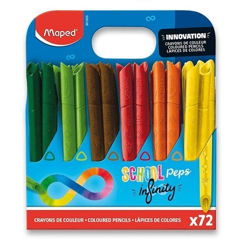 Školní sada 72 ks bezdřevých pastelek Maped Color'Peps Infinity s originálním patentovaným designem, který umožňuje kreslit oběma stranami. Pastelky tvoří 100% tuha a není nutné ji ořezávat a mají tedy nulový odpad. Ostří se samy při vybarvování. Pastelky mají trojhranné tělo pro snadný a pohodlný úchop a jasné barvy. Díky sytým barvám není nutné na pastelky tlačit. Souprava ideální pro učitele.