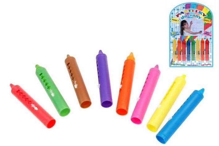 8 barevných pastelek do vany .Pomocí těchto úžasných pastelek můžete kreslit barevné obrázky na vanu, kachličky nebo kůži.