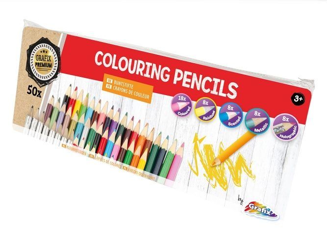 Pastelky v kovové krabičce 50 ks – pastelky obsahuje 18 ks standardních pastelek, 8 ks duhových pastelek, 8 ks holografických pastelek, 8 ks metalických pastelek a 8 ks voňavých pastelek.