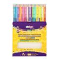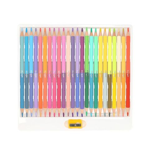24 dvoubarevných oboustranných pastelek, 48 barev, vyrobených z měkkého lipového dřeva. Vnitřní grafit má tloušťku 3,0 mm. Ořezávátko je součásti balení.