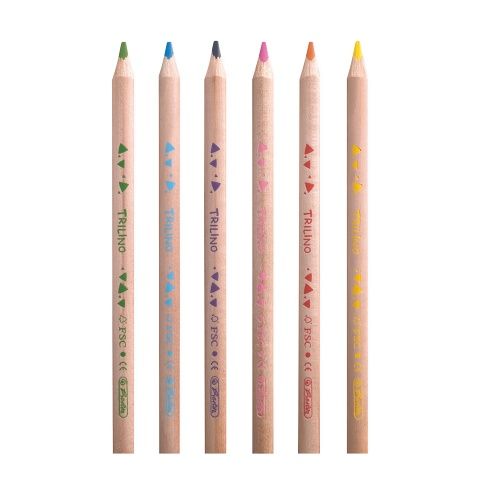 6 trojhranných pastelek Trilino, dřevo, FSC 100%, jumbo, trojúhelníkový tvar, průměr tuhy 5 mm, s tuhou odolnou proti zlomení, v závěsném balení s motivem Mořské panny, barvy: žlutá, oranžová, růžová, fialová, světle modrá, světle zelená