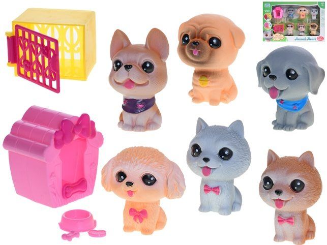 Pejsci 7-8cm po stisknutí pískací s doplňky 6ks v krabičce