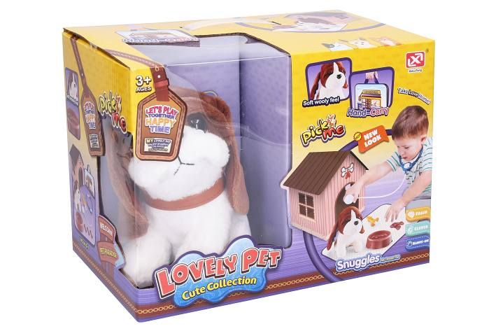 Pejsek s boudou a taštičkou. Velikost pejska 18 cm. Balení obsahuje plyšového pejska, tašku s doplňky a boudu ke složení. Návod na krabici. Doplňky: miska, injekce, stetoskop, pamlsky.