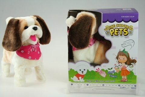 Pejsek s šátkem na tleskutí o velikosti cca 18 cm X 23 cm. Pejsek se ovládá tlesknutím - pokud tleskneme ,pejsek začne chodit a štěkat,po chvíli se zastaví.Provoz na 4 baterie AA.Věk 3+