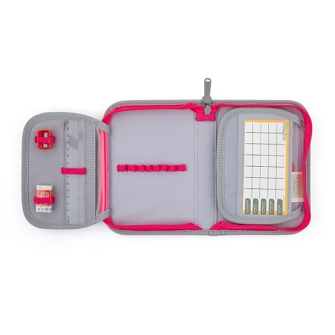 Jednopatrový školní penál s plyšovým efektem se 2 chlopněmi, prázdný obsahuje 25 gumových poutek pro uchycení psacích potřeb. Na vnitřních chlopních jsou průhledné fólie pro rozvrh hodin.
