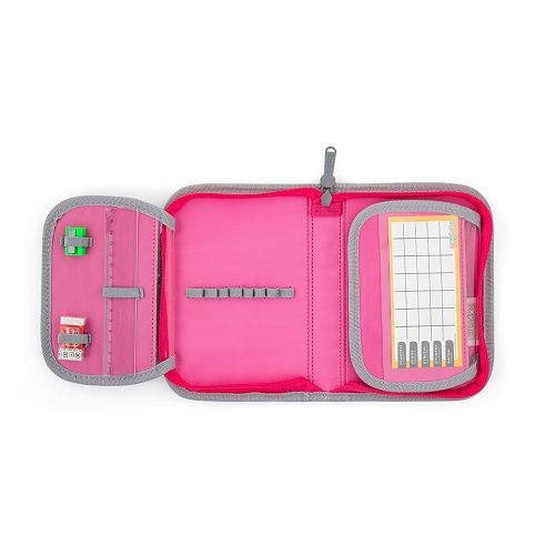 Jednopatrový školní penál s plyšovým efektem se 2 chlopněmi, prázdný obsahuje 25 gumových poutek pro uchycení psacích potřeb. Na vnitřních chlopních jsou průhledné fólie pro rozvrh hodin.