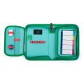 Jednopatrový školní penál se 2 chlopněmi, prázdný obsahuje 25 gumových poutek pro uchycení psacích potřeb. Na vnitřních chlopních jsou průhledné fólie pro rozvrh hodin.
