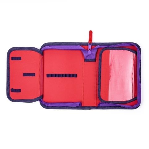 Jednopatrový školní penál se 2 chlopněmi, prázdný obsahuje 25 gumových poutek pro uchycení psacích potřeb. Na vnitřních chlopních jsou průhledné fólie pro rozvrh hodin.