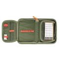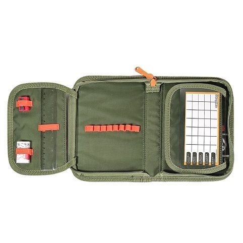 Jednopatrový školní penál s 2 chlopněmi, prázdný obsahuje 25 gumových poutek pro uchycení psacích potřeb. Na vnitřních chlopních jsou průhledné fólie pro rozvrh hodin.