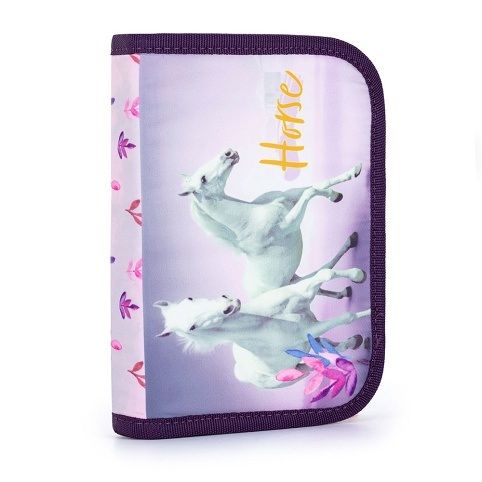 Jednopatrový školní penál se 2 chlopněmi, prázdný obsahuje 25 gumových poutek pro uchycení psacích potřeb. Na vnitřních chlopních jsou průhledné fólie pro rozvrh hodin.