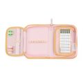 Jednopatrový školní penál s 2 chlopněmi, prázdný obsahuje 25 gumových poutek pro uchycení psacích potřeb. Na vnitřních chlopních jsou průhledné fólie pro rozvrh hodin.
