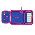 Jednopatrový školní penál se 2 chlopněmi, prázdný obsahuje 25 gumových poutek pro uchycení psacích potřeb. Na vnitřních chlopních jsou průhledné fólie pro rozvrh hodin.
